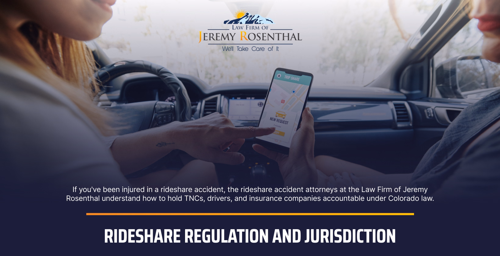 If you’ve been injured in a rideshare accident, the Denver rideshare accident attorneys at the Law Firm of Jeremy Rosenthal understand how to hold TNCs, drivers, and insurance companies accountable under Colorado law. Schedule a free consultation with our experienced rideshare accident attorneys to discuss your case, understand your rights, and explore your options for compensation. Don’t let complicated regulations prevent you from getting the justice and financial recovery you deserve.